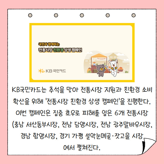 [프라임경제] KB국민카드는 추석을 맞아 전통시장 지원과 친환경 소비 확산을 위해 '전통시장 친환경 상생 캠페인'을 진행한다. 이번 캠페인은 집중 호우로 피해를 입은 6개 전통시장(충남 서산동부시장, 전남 담양시장, 전남 광주 말바우시장, 경남 함양시장, 경기 가평 설악눈메골·잣고을 시장)에서 펼쳐진다.