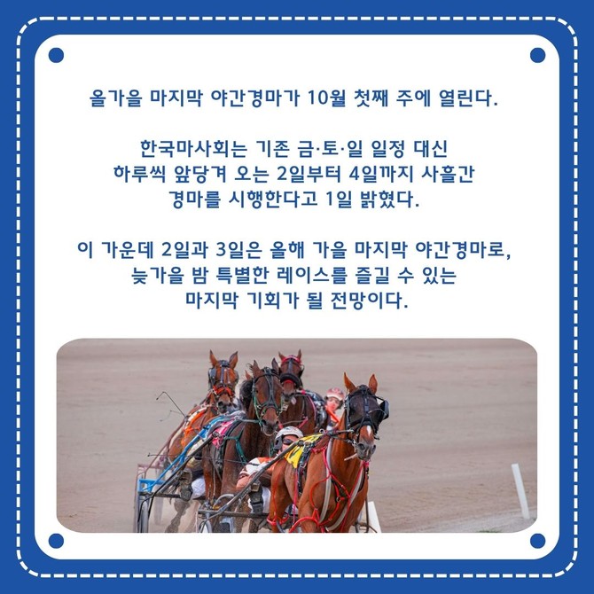 [프라임경제] 올가을 마지막 야간경마가 10월 첫째 주에 열린다.