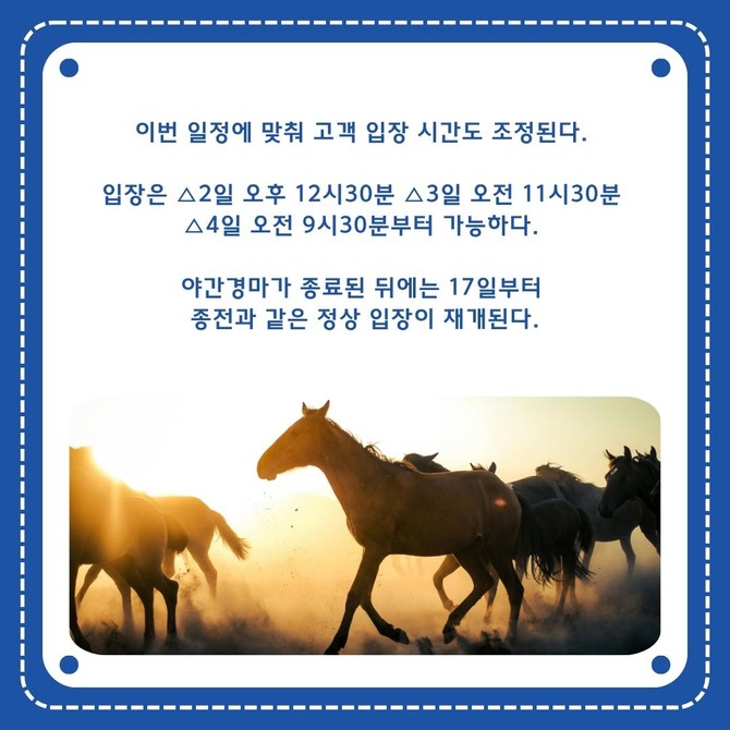한국마사회(회장 정기환)는 기존 금·토·일 일정 대신 하루씩 앞당겨 오는 2일부터 4일까지 사흘간 경마를 시행한다고 1일 밝혔다.