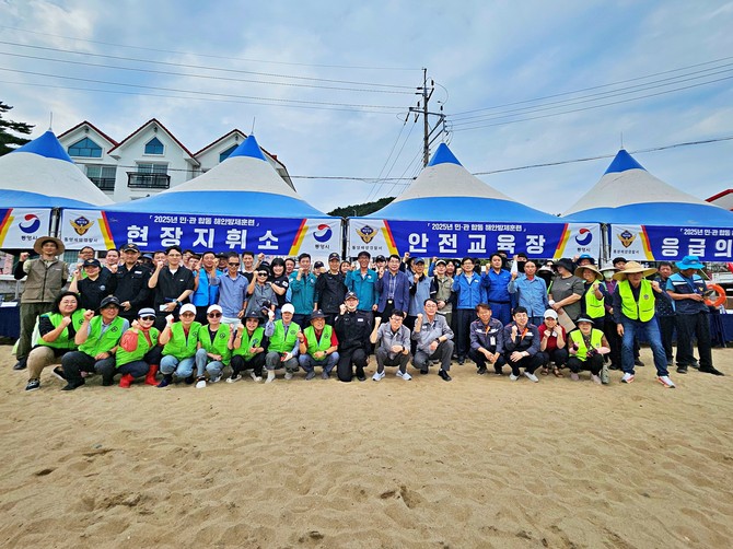 통영해양경찰서는 30일 통영시 수륙해수욕장에서 해안오염사고에 대비해 2025년 민·관 합동 해안방제 훈련을 실시했다고 밝혔다.
