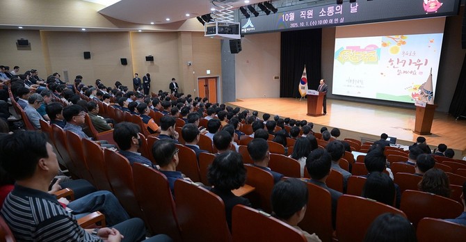 최 시장은 1일 시청 여민실에서 열린 10월 '직원 소통의 날' 행사에서 여름철 폭염과 폭우 등 재난 대응, 최근 화재 대응 등 그동안 직원들의 노고를 치하하며 "올해 유난히 다사다난했지만, 어떤 문제가 생길 때마다 결국 해내는 모습을 봤다. 이는 대한민국 공무원들이기에 가능한 일"이라고 말했다.
