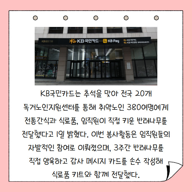 [프라임경제] KB국민카드는 추석을 맞아 전국 20개 독거노인지원센터를 통해 취약노인 380여명에게 전통간식과 식료품, 임직원이 직접 키운 반려나무를 전달했다고 1일 밝혔다. 이번 봉사활동은 임직원들의 자발적인 참여로 이뤄졌으며, 3주간 반려나무를 직접 양육하고 감사 메시지 카드를 손수 작성해 식료품 키트와 함께 전달했다.