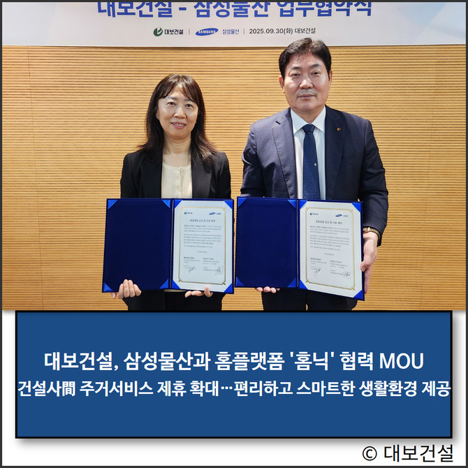 대보건설이 본사 대회의실에서 삼성물산 건설부문과 스마트 홈플랫폼 '홈닉' 적용을 위한 기술협력 양해각서(MOU)를 체결했다.