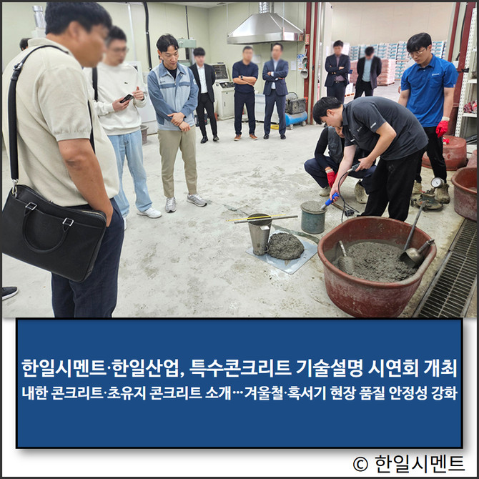한일시멘트 기술연구소 관계자는 "내한 콘크리트와 초유지 콘크리트는 계절과 환경 제약으로 발생하는 시공 현장의 난제를 해결하기 위한 기술"이라며 "앞으로도 지속적인 연구개발을 통해 건설 산업 전반의 효율성과 품질을 높이는 데 기여하겠다"고 전했다.
