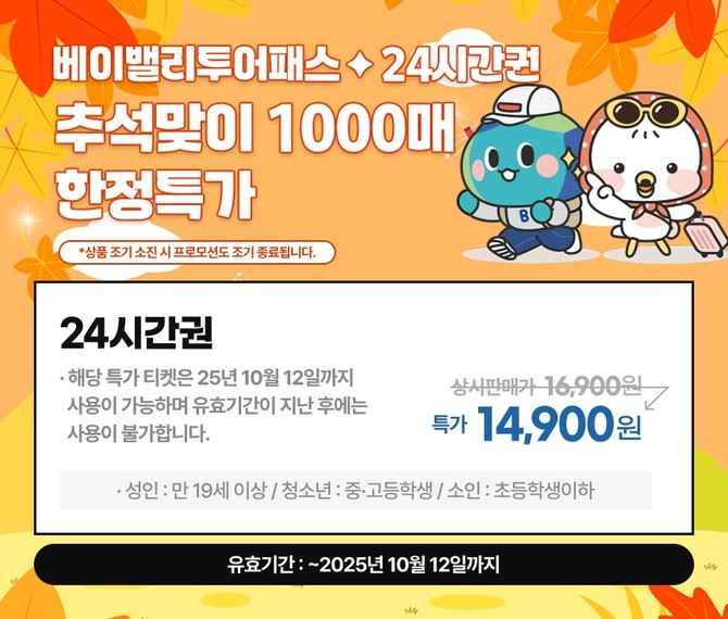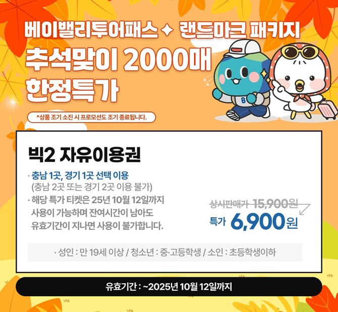 [프라임경제] 충남문화관광재단(대표이사 이기진)은 다가오는 추석 연휴를 맞아 충남을 방문하는 관광객들을 위해 '베이밸리 투어패스' 추석 특가 프로모션을 진행한다고 1일 밝혔다.
