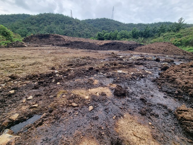 현장 확인 결과, 마을 이장조차 야적 시점을 모를 정도로 장기간 방치된 것으로 추정되며, 이는 '가축분뇨의 관리 및 이용에 관한 법률' 상 퇴비화 신고 및 적절한 보호 조치 의무를 명백히 위반한 행위로 보인다.