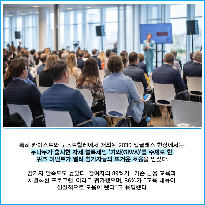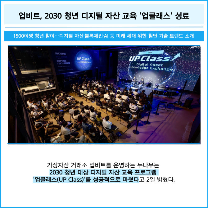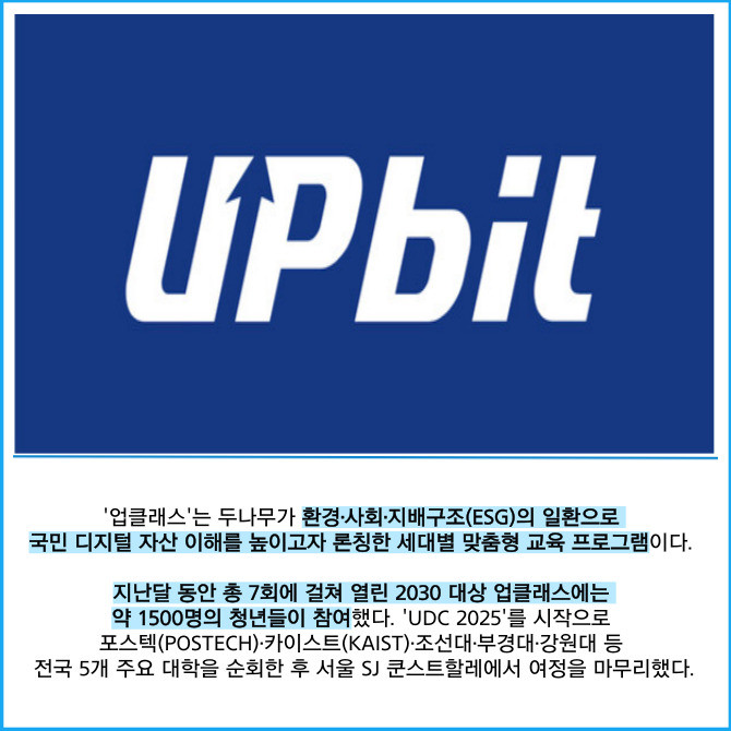 [프라임경제] 가상자산 거래소 업비트를 운영하는 두나무는 2030 청년 대상 디지털 자산 교육 프로그램 '업클래스(UP Class)'를 성공적으로 마쳤다고 2일 밝혔다.