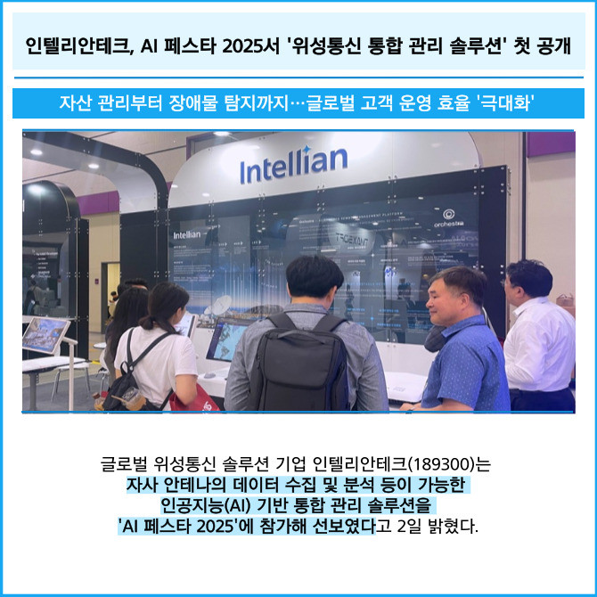 [프라임경제] 글로벌 위성통신 솔루션 기업 인텔리안테크(189300)는 자사 안테나의 데이터 수집 및 분석 등이 가능한 인공지능(AI) 기반 통합 관리 솔루션을 'AI 페스타 2025'에 참가해 선보였다고 2일 밝혔다.