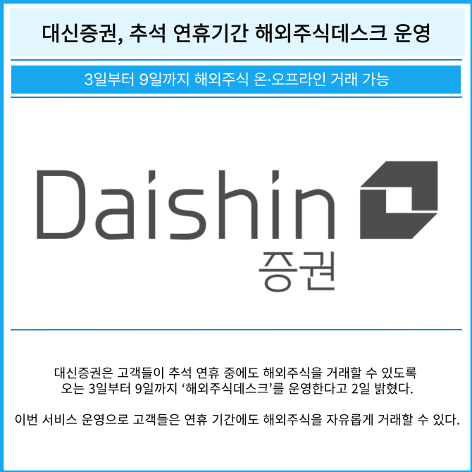[카드] 대신증권, 추석 연휴기간 해외주식데스크 운영