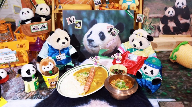 캐릭터 메뉴도 준비했다. 에버랜드 대표 캐릭터가 그려진 소시지를 통으로 올린 '레니라라 소시지 카레', 래서판다 얼굴 라떼아트가 더해진 '바나나크림라떼' 등이다.