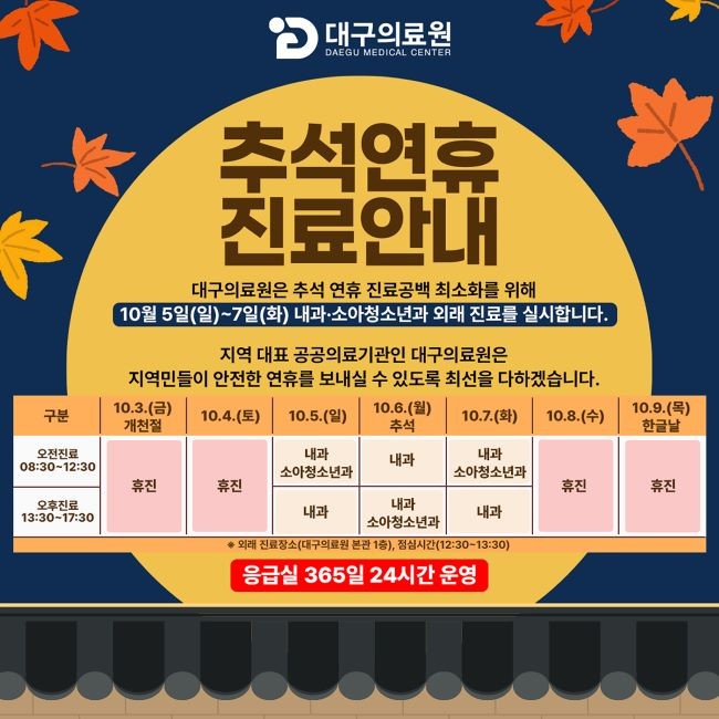 [프라임경제] 대구의료원(의료원장 김시오)이 추석 연휴 기간(10.3.~10.9.) 응급실 운영을 강화하고, 오는 5일부터 7일까지 내과·소아청소년과 외래 진료를 실시한다.
