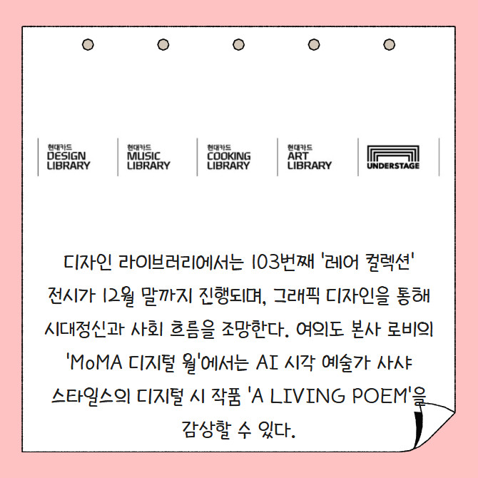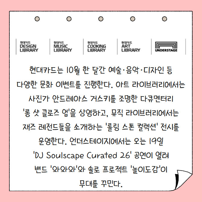 [프라임경제] 현대카드는 10월 한 달간 예술·음악·디자인 등 다양한 문화 이벤트를 진행한다. 아트 라이브러리에서는 사진가 안드레아스 거스키를 조명한 다큐멘터리 '롱 샷 클로즈 업'을 상영하고, 뮤직 라이브러리에서는 재즈 레전드들을 소개하는 '롤링 스톤 컬렉션' 전시를 운영한다. 언더스테이지에서는 오는 19일 'DJ Soulscape Curated 26' 공연이 열려 밴드 '와와와'와 솔로 프로젝트 '놀이도감'이 무대를 꾸민다.
