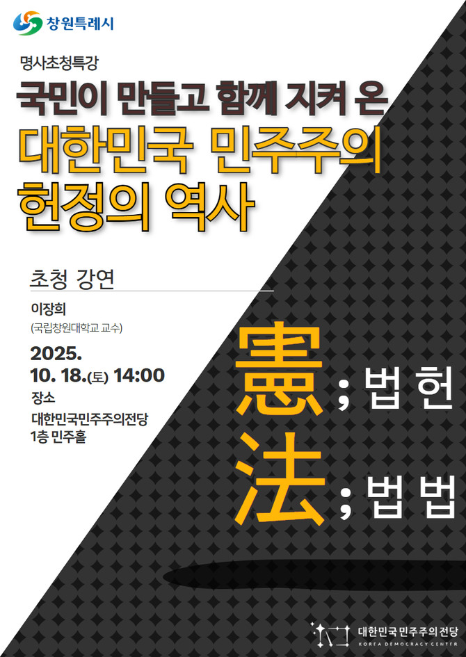 국립창원대학교 법학과 이장희 교수가 강사로 나서는 이번 강연은 대한민국 민주주의의 발전 과정과 헌정사의 주요 사건 등을 다루고, 민주주의의 근본적인 가치와 각 시대를 관통하는 헌정의 의미를 설명할 계획이다.