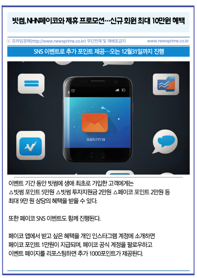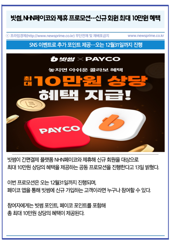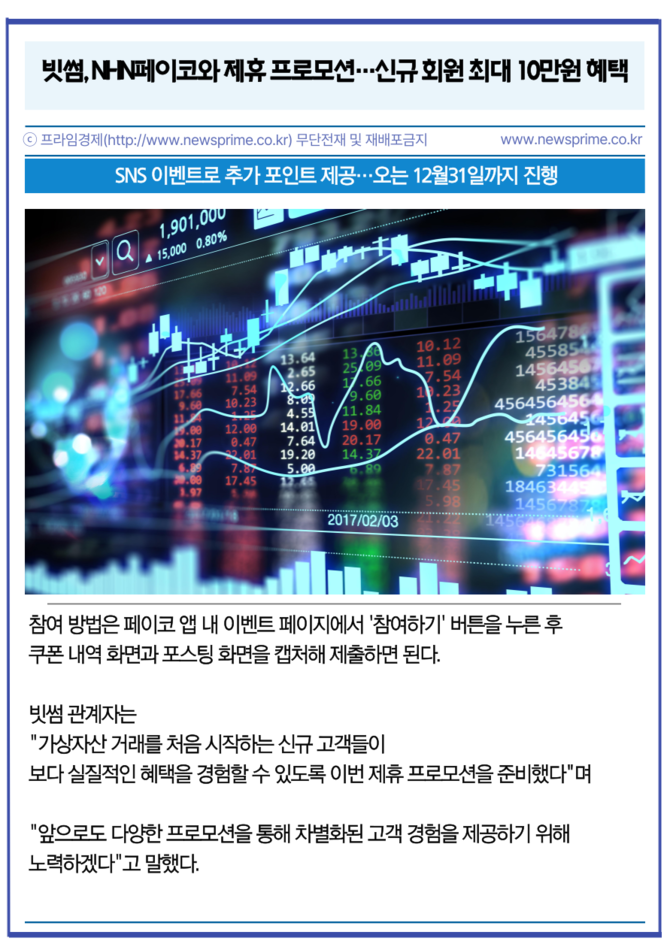 [프라임경제] 빗썸이 간편결제 플랫폼 NHN페이코와 제휴해 신규 회원을 대상으로 최대 10만원 상당의 혜택을 제공하는 공동 프로모션을 진행한다고 13일 밝혔다.