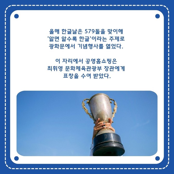 공영홈쇼핑은 지난 11일 광화문광장 놀이마당에서 열린 '2025년 한글한마당 기념행사'에서 바른 우리말 쓰기 실천 공로로 문화체육관광부 장관 표창을 수상했다고 13일 밝혔다.