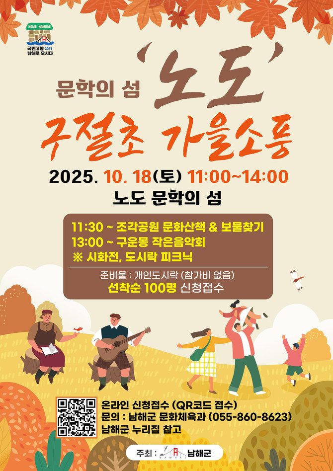참가는 선착순 100명을 대상으로 하며, 신청은 포스터 내 QR코드를 통해 온라인으로 접수 가능하다. 자세한 사항은 남해군 문화체육과(055-860-8623)로 문의하면 된다.