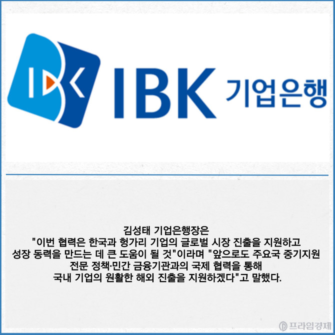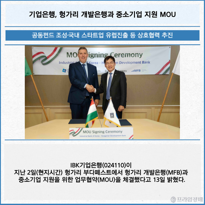 [프라임경제] IBK기업은행(024110)이 지난 2일(현지시간) 헝가리 부다페스트에서 헝가리 개발은행(MFB)과 양국 중소기업 지원을 위한 업무협약(MOU)을 체결했다고 13일 밝혔다.
