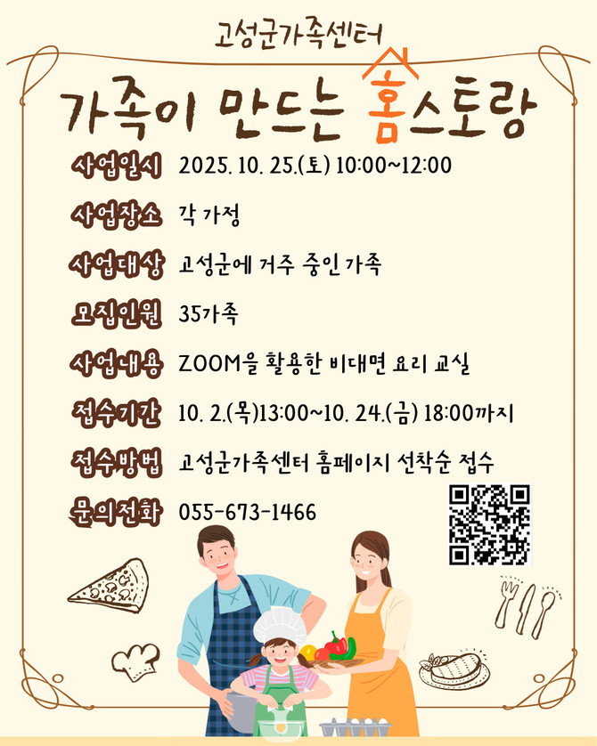 고성군가족센터(센터장 황순옥)는 오는 10월24일까지 집에서 즐기는 비대면 요리프로그램 '가족이 만드는 홈스토랑' 참여 가족을 모집한다고 밝혔다.
