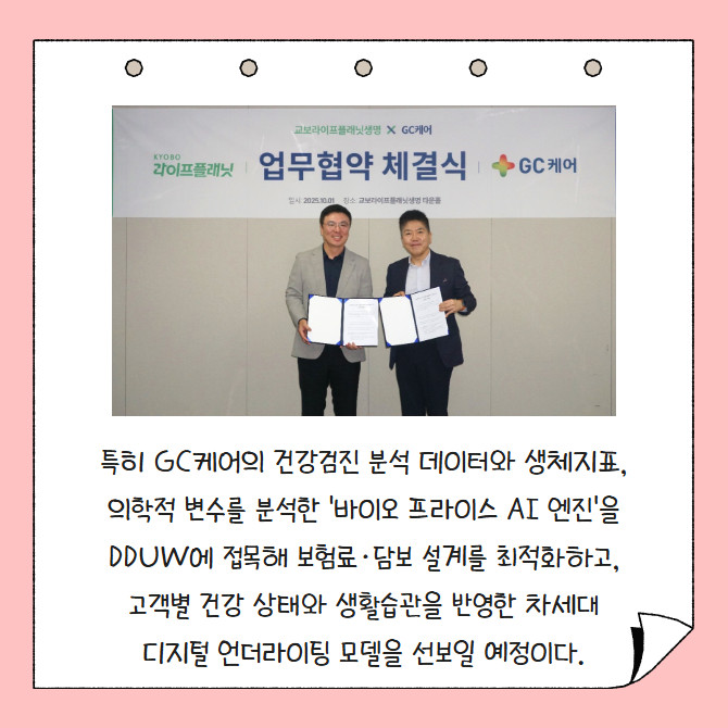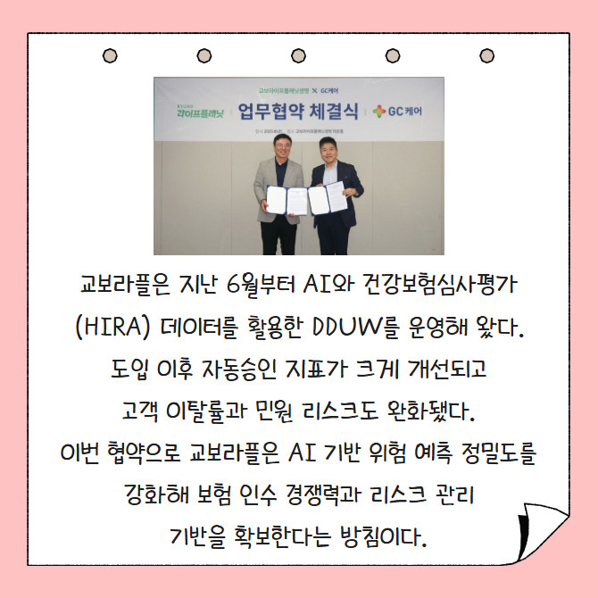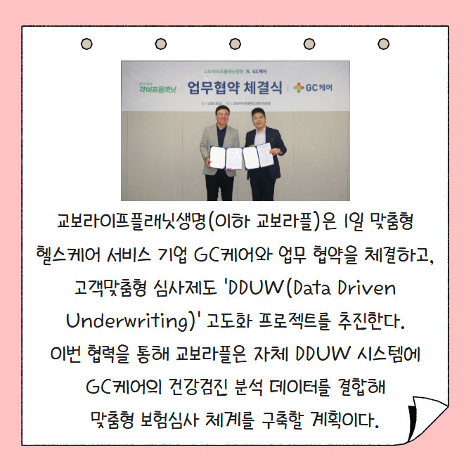 [프라임경제] 교보라이프플래닛생명(이하 교보라플)은 1일 맞춤형 헬스케어 서비스 기업 GC케어와 업무 협약을 체결하고, 고객맞춤형 심사제도 'DDUW(Data Driven Underwriting)' 고도화 프로젝트를 추진한다. 이번 협력을 통해 교보라플은 자체 DDUW 시스템에 GC케어의 건강검진 분석 데이터를 결합해 맞춤형 보험심사 체계를 구축할 계획이다.