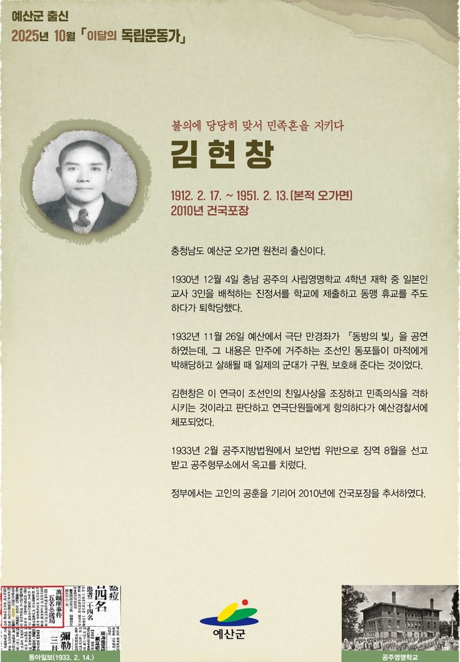 [프라임경제] 충남 예산군은 오가면 원천리 출신 김현창 선생을 '2025년 10월 이달의 독립운동가'로 선정했다고 밝혔다.