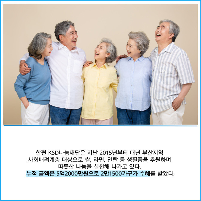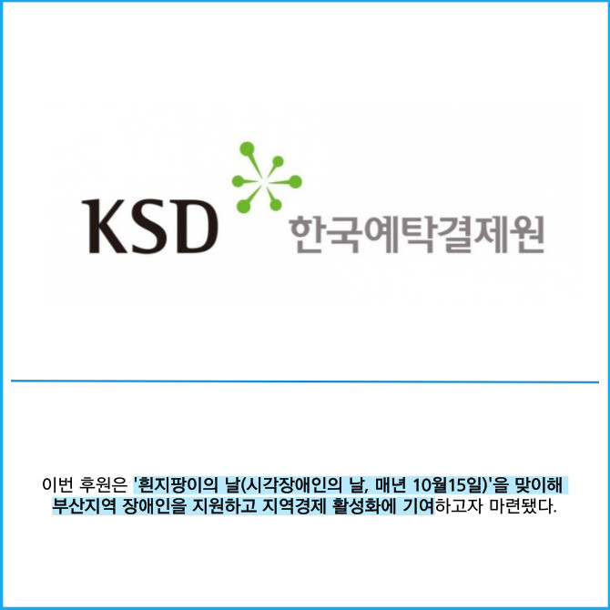 [프라임경제] 한국예탁결제원 KSD나눔재단은 지난 14일 부산 본사에서 '사랑의 생필품 나눔 행사' 후원을 위해 부산남구장애인 협회와 부산시각장애인복지연합회 2곳에 후원금 총 6000만원(단체당 3000만원)을 전달했다고 15일 밝혔다.