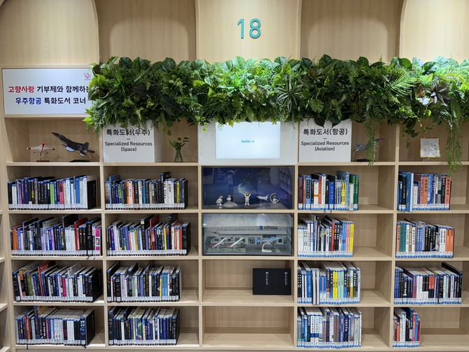 또 관련 서가에는 우주와 항공을 주제로 한 디스플레이와 사천시 항공 우주 관련 홍보영상 함께 구성돼 시각적 몰입감을 더했다.