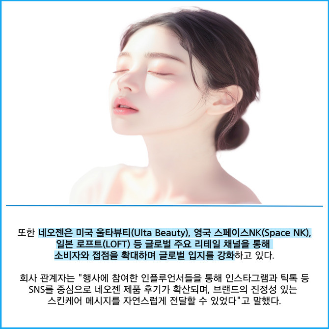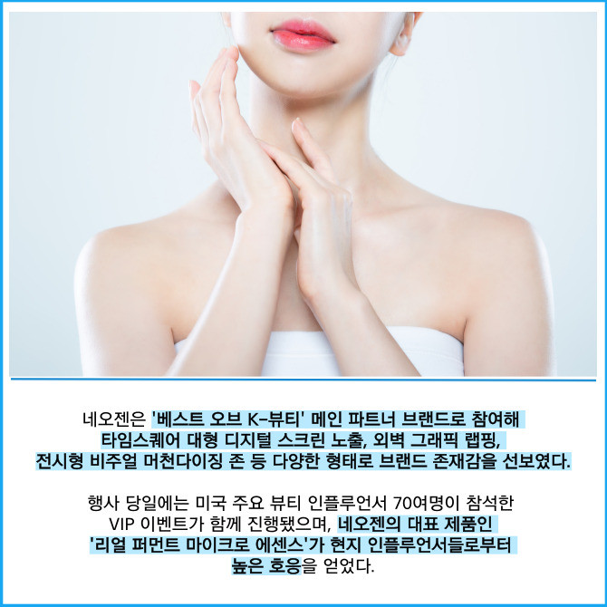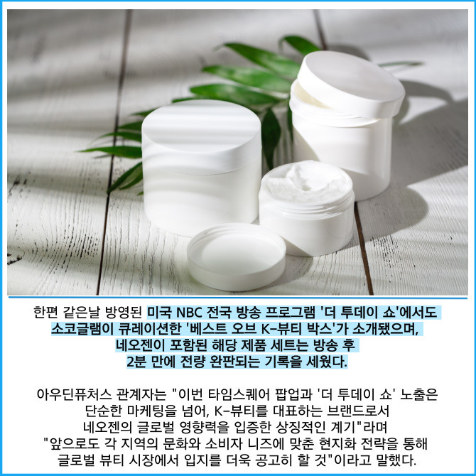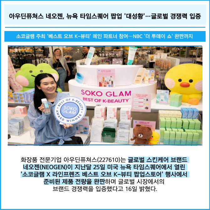 [프라임경제] 화장품 전문기업 아우딘퓨쳐스(227610)는 글로벌 스킨케어 브랜드 네오젠(NEOGEN)이 지난달 25일 미국 뉴욕 타임스퀘어에서 열린 '소코글램 X 라인프렌즈 베스트 오브 K-뷰티 팝업스토어' 행사에서 준비된 제품 전량을 완판하며 글로벌 시장에서의 브랜드 경쟁력을 입증했다고 16일 밝혔다.
