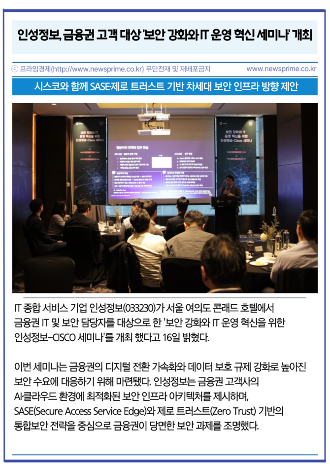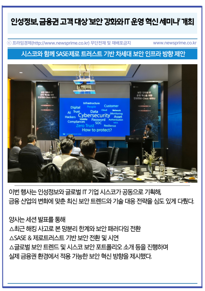 [프라임경제] IT 종합 서비스 기업 인성정보(033230)가 서울 여의도 콘래드 호텔에서 금융권 IT 및 보안 담당자를 대상으로 한 '보안 강화와 IT 운영 혁신을 위한 인성정보-CISCO 세미나'를 개최 했다고 16일 밝혔다.