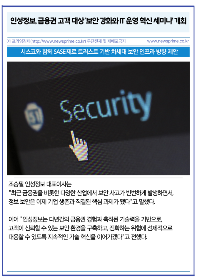 이번 세미나는 금융권의 디지털 전환 가속화와 데이터 보호 규제 강화로 높아진 보안 수요에 대응하기 위해 마련됐다. 인성정보는 금융권 고객사의 AI·클라우드 환경에 최적화된 보안 인프라 아키텍처를 제시하며, SASE(Secure Access Service Edge)와 제로 트러스트(Zero Trust) 기반의 통합보안 전략을 중심으로 금융권이 당면한 보안 과제를 조명했다.