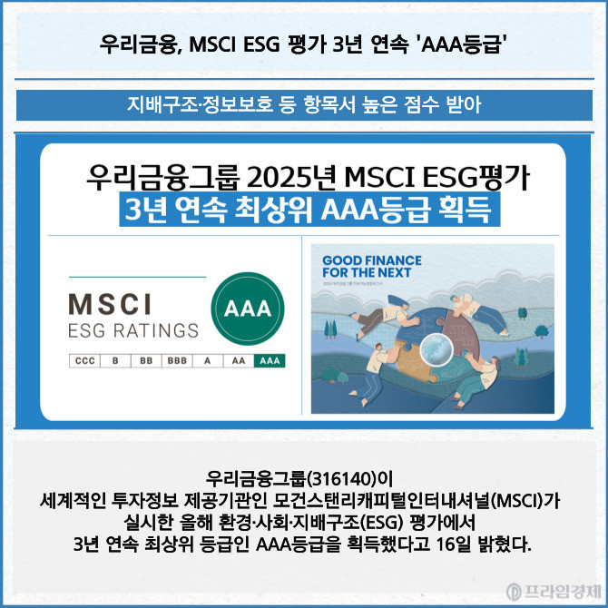 [프라임경제] 우리금융그룹(316140)이 세계적인 투자정보 제공기관인 모건스탠리캐피털인터내셔널(MSCI)가 실시한 올해 환경·사회·지배구조(ESG) 평가에서 3년 연속 최상위 등급인 AAA등급을 획득했다고 16일 밝혔다.