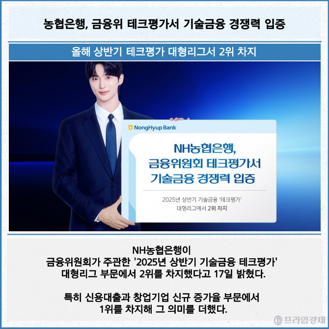 [프라임경제] NH농협은행이 금융위원회가 주관한 '2025년 상반기 기술금융 테크평가' 대형리그 부문에서 2위를 차지했다고 17일 밝혔다.