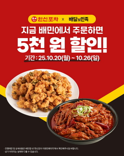 더본코리아(475560)의 실내포차 브랜드 '한신포차'가 오는 20일부터 26일까지 '배달의민족' 주문 고객을 대상으로 5000원 할인 프로모션을 진행한다.