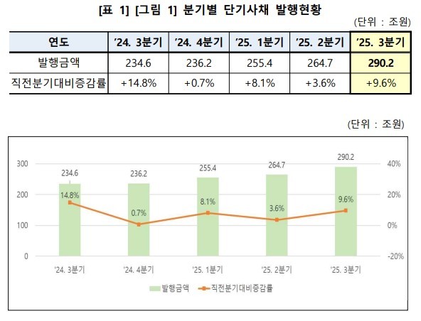 17일 한국예탁결제원에 따르면 올해 3분기 단기사채를 통한 국내 자금조달 규모가 290조2000억원으로 집계됐다. 이는 전년 동기 대비 23.7% 증가한 수치로, 전분기와 비교하면 9.6% 늘어났다.
