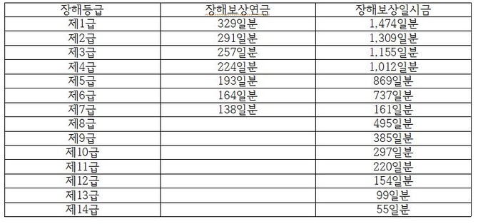 장해등급에 따른 장해급여 지급일수는 다음과 같다.