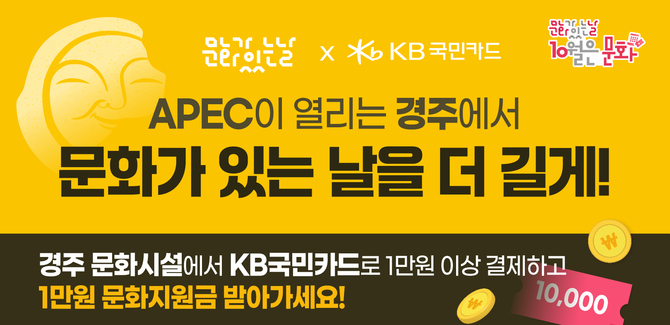 KB국민카드는 오는 20일부터 다음달 2일까지 '제 33회 아시아태평양경제협력체(APEC) 정상회의'가 열리는 경주에서 문화시설를 이용하면 문화지원금을 제공하는 '10월 문화가 있는 날은 APEC 개최지 경주에서' 행사를 실시한다.