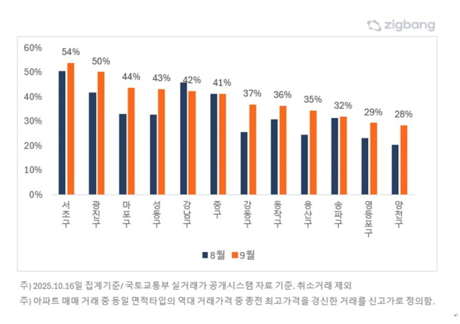 이런 흐름은 양천·영등포·서대문 등 이른바 중간권 지역으로 점차 확산되는 양상이다. 9월 기준 영등포구(29%)와 양천구(28%), 서대문구(24%) 등에서 신고가 거래 비중이 확대됐다. 반면 노원·도봉·금천 등 외곽 일부 지역은 신고가 비중이 한 자릿수에 머물며 확산 영향이 제한적이었다.