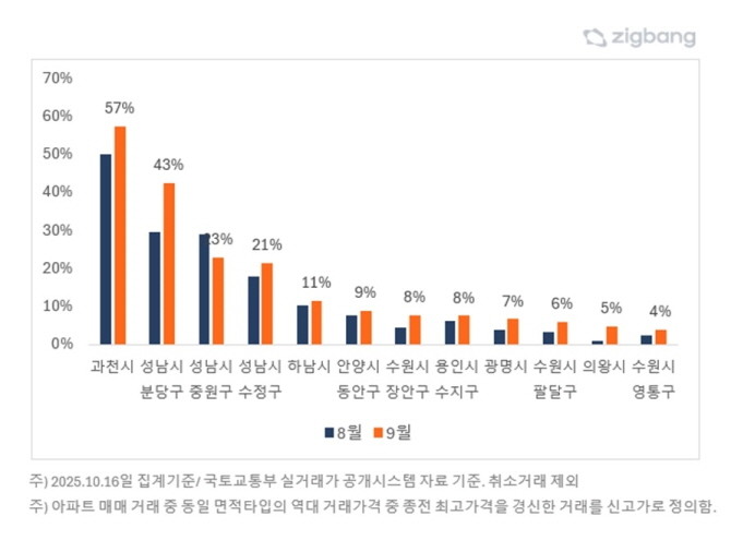 실제 9월 기준 △과천 57% △성남 분당구 43% △하남 11% 등 신고가 비중이 높았다. 더불어 △성남 수정구 21%·중원구 23% △의왕 5% △안양 동안구9% 등에서도 신고가 사례가 확인되며 회복 흐름이 수도권으로 확산되는 양상이 관찰됐다.