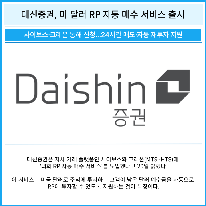 [프라임경제] 대신증권은 자사 거래 플랫폼인 사이보스와 크레온(MTS·HTS)에 '외화 RP 자동 매수 서비스'를 도입했다고 20일 밝혔다.