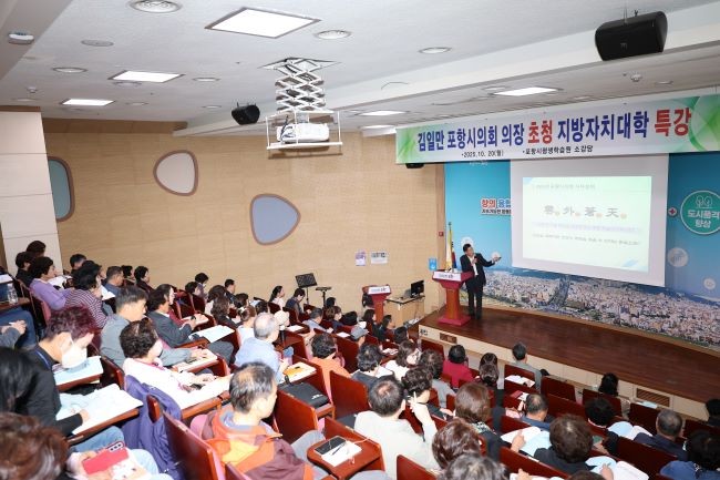 이날 특강에서 김 의장은 '신뢰받는 의정, 힘이 되는 의회'를 주제로 △지방자치의 의의 △지방의회 기능과 역할 △포항시의회 현황과 운영 방향 등에 대해 설명과 함께, △첨단산업도시 △푸른 정원도시 △해양문화관광 콘텐츠도시 등 포항의 미래 모습을 제시하며 신산업 육성을 통한 산업구조 다변화, 국제전시컨벤션센터 건립 등 MICE산업 육성, 북방물류 거점항만 구축 등 포항시의 주요사업을 소개했다.