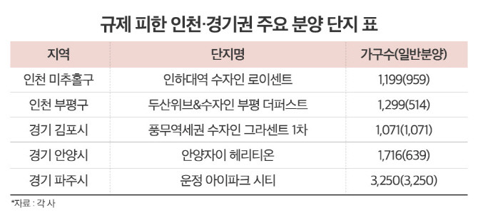 업계 관계자는 "서울과 경기 일부 규제지역에서 대출과 거래가 제한되면서 수요자들이 비규제 지역으로 눈을 돌릴 가능성이 크다"라며 "인천과 경기 비규제 지역에서는 인기 단지 중심으로 청약 경쟁이 심화되고, 단기간 내 매매가 상승과 공급 부족 현상이 동시에 나타날 수 있다"라고 설명했다.