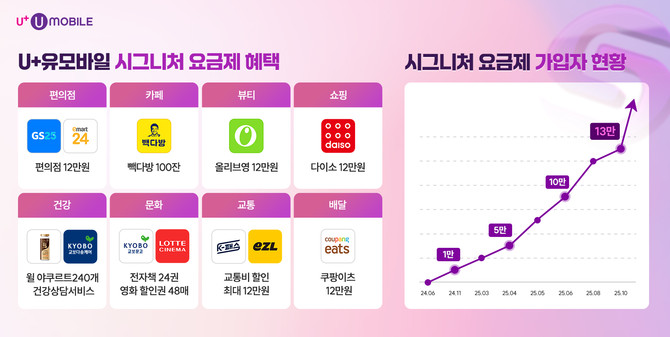 생활 혜택 요금제는 이달 기준 누적 가입자 13만명을 돌파하며 빠른 성장세를 입증했다. U+유모바일 전체 누적 가입자가 110만명 수준임을 감안하면, 가입자의 약 10% 이상이 해당 요금제를 이용 중인 것이다.