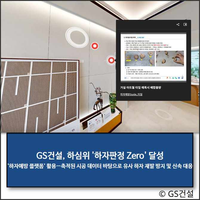GS건설(006360)이 '하자예방 플랫폼'을 활용, 공동주택의 하자 발생원인 분석부터 설계 및 시공 기준 수립, 선제적 예방에 이르는 하자 예방 선순환 구조를 구축해 국토교통부 '하자심사·분쟁조정위원회(이하 하심위)'가 10월 발표한 하반기 하자판정 조사에서 하자판정 '0'건을 기록, 최근 1년간 하자판정 '0'건을 달성했다고 21일 밝혔다.