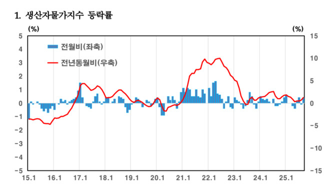 생산자물가는 소비재·자본재뿐 아니라 기업 생산 과정에 투입되는 원재료·중간재 등까지 측정한 물가 지수다. 생산자물가는 일정 시차를 두고 소비자물가에 영향을 미치는 선행지표로 간주한다.