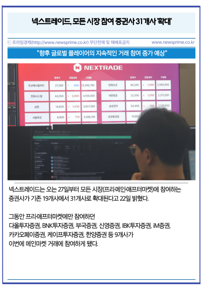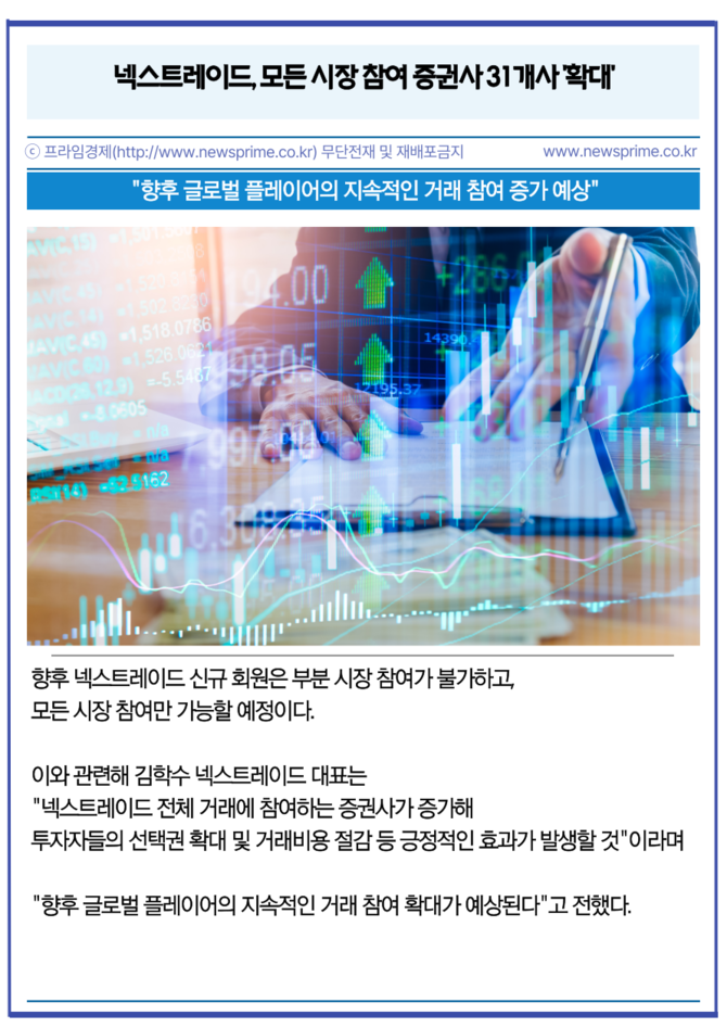 [프라임경제] 넥스트레이드는 오는 27일부터 모든 시장(프리·메인·애프터마켓)에 참여하는 증권사가 기존 19개사에서 31개사로 확대된다고 22일 밝혔다.