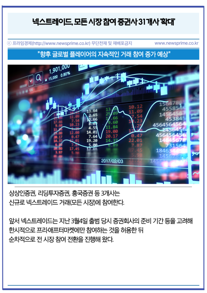 상상인증권, 리딩투자증권, 흥국증권 등 3개사는 신규로 넥스트레이드 거래(모든 시장)에 참여한다.