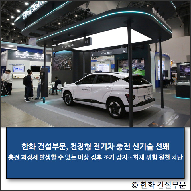 한화 건설부문은 '전기차 화재 ZERO'를 목표로 해당 솔루션을 입주단지 내 시범 적용할 계획이다. 김민석 한화 건설부문 건축사업본부장은 "EV air station은 신규 화재감지 기술을 적용해 한층 강화된 안전성을 갖춘 전기차 충전 솔루션"이라며 "향후 지하주차장 화재진압 기술까지 더해 스마트 건축 솔루션을 지속 확대해 나가겠다"고 말했다.