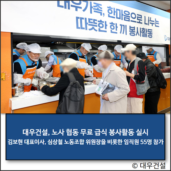 이날 진행된 대우건설 Day에는 김보현 대표이사와 심상철 노동조합 위원장을 비롯한 임직원 55명이 자발적으로 참여하며 의미를 더했다. 경영진과 노동조합이 함께 참여한 봉사단은 어르신들의 입장 안내부터 배식, 식기 세척, 퇴식 안내에 이르기까지 급식 운영의 전 과정에 배치되어 어르신들이 따뜻하고 편안하게 식사하실 수 있는 환경을 조성했다.