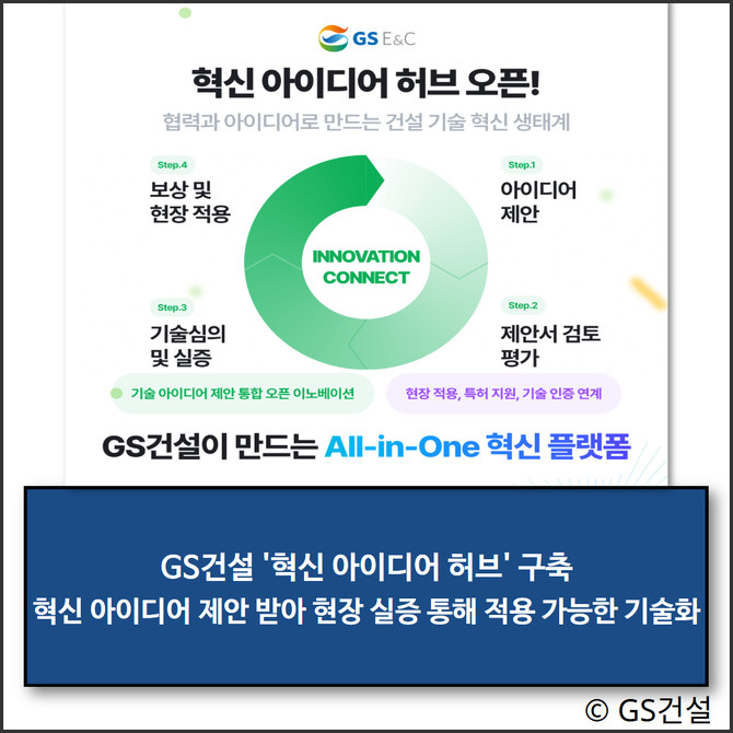 특히 보유한 신기술을 적용하고 상용화할 수 있는 사업적 인프라나 지원역량이 부족한 외부 기업도 이번 신설된 플랫폼을 통해 우수제안사로 선정되면, GS건설의 현장 실증 지원과 상용화 기회를 제공받는다. 채택된 제안에 대해서는 소정의 포상과 함께 특허 출원 지원, 입찰 참여 기회 부여 등 실질적인 보상을 함으로써 파트너사와 기술 동반성장 체계를 갖추게 된다.