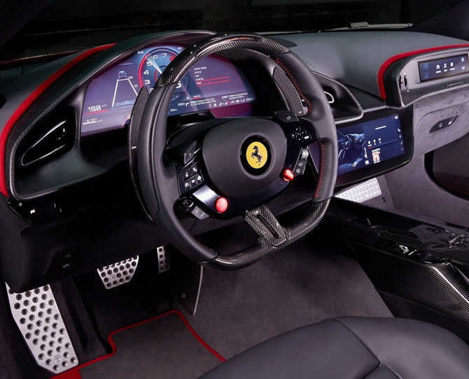 페라리의 상징인 시동 버튼 역시 물리 버튼으로 돌아왔다. 또 운전자와 동승자 모두가 상호작용할 수 있도록 대시보드 중앙에 수평형 터치스크린을 배치해 편의성을 높였다.