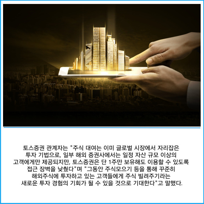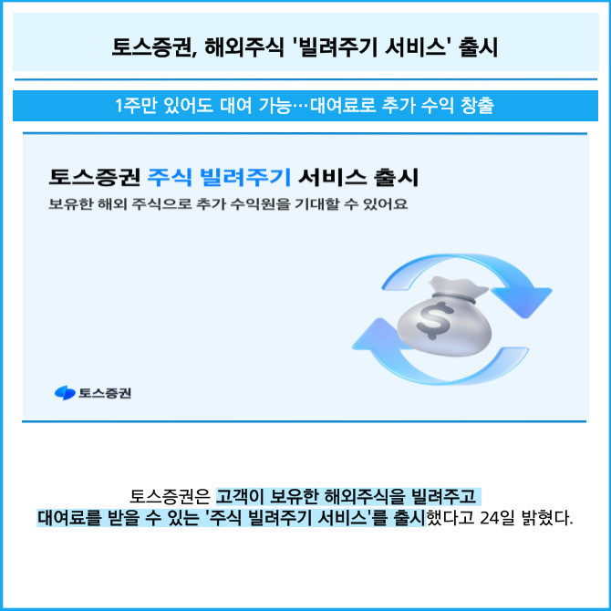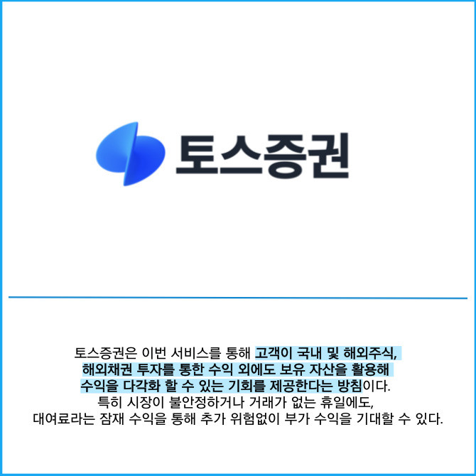 [프라임경제] 토스증권은 고객이 보유한 해외주식을 빌려주고 대여료를 받을 수 있는 '주식 빌려주기 서비스'를 출시했다고 24일 밝혔다.